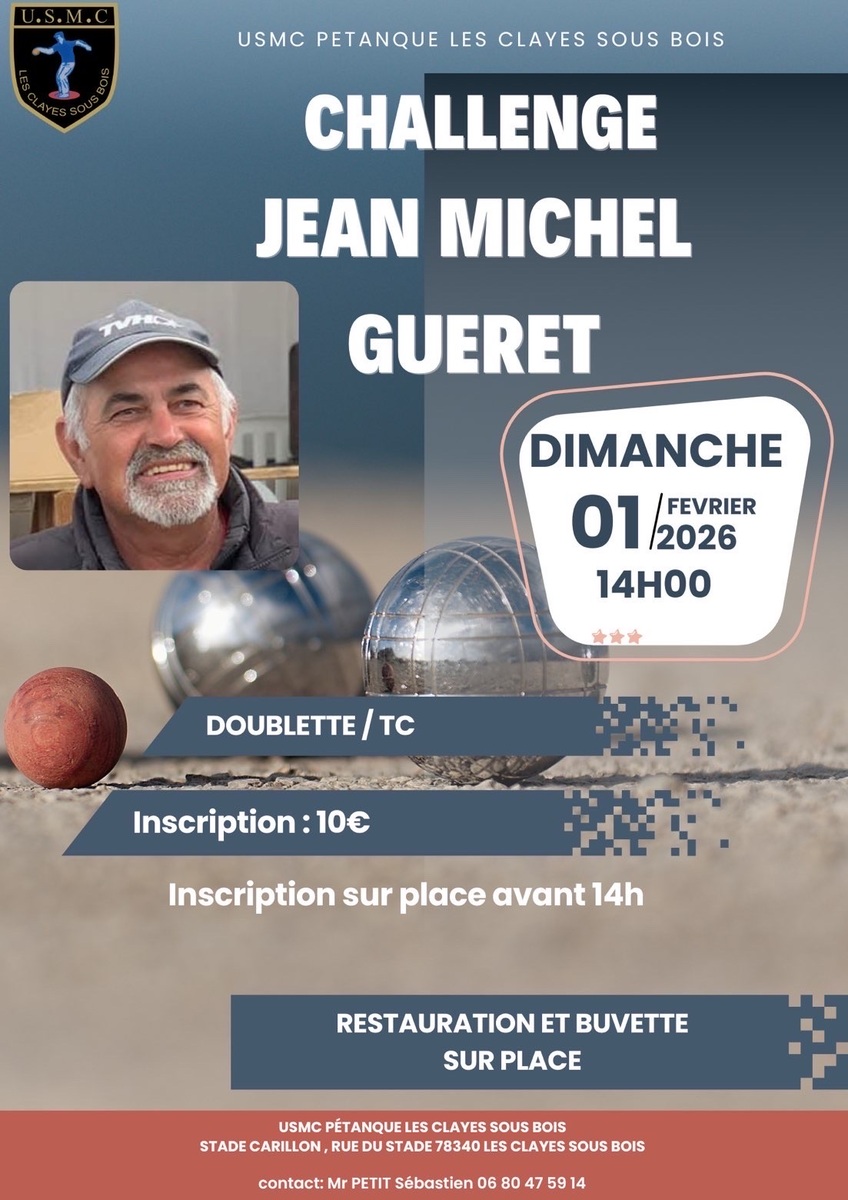 Le dimanche 1er février aura lieu le premier challenge Jean-Michel Guéret en doublette toute catégorie. Ce tournoi vise à honorer sa mémoire et sa passion pour la pétanque. Nous vous attendons nombreux pour participer à cette compétition et rendre hommage à Jean Michel dans le respect et la convivialité.